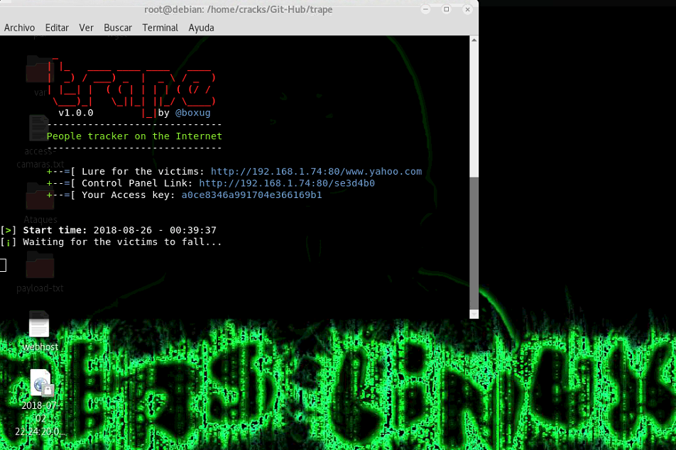 Trape es una herramienta de reconocimiento que te permite rastrear a las personas y hacer ataques de phishing en tiempo real, la información que puedes obtener es muy detallada. Se quiere enseñar al mundo a través de esto, cómo las las grandes compañías de Internet pueden monitorearte, obteniendo información más allá de tu dirección IP, como la conexión de tus sesiones a sitios web o servicios en Internet.